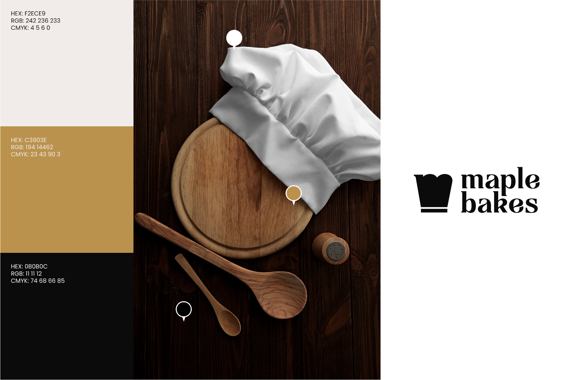 The logo takes the shape of a baker’s hat, abstracted from the letter “M,” symbolizing skill and warmth in one refined mark. Paired with a typographic system that fuses old-fashioned charm with modern simplicity, the identity embodies quiet confidence. The palette — warm maple tones, soft neutrals, and deep black — evokes comfort and sophistication, creating a brand that feels inviting, premium, and timeless.